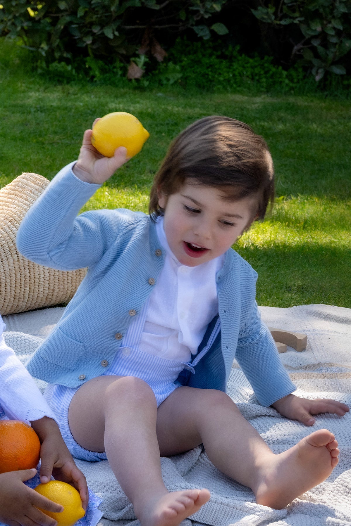 Classic and versatile, this Adrian Cardigan is tailored with time-honored European craftsmanship in Bluebell. Made from 100% breathable cotton, it offers lightweight comfort for seasonal layering. Its refined silhouette, subtle button detail at the back, and timeless design make it a piece made to carry little ones through every season in style.