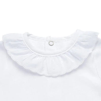 An elevated essential, this baby onesie is made from 100% cotton for all-day softness and breathability. The delicate embroidered ruffle collar adds a vintage-inspired finish—perfect layered under knits or worn on its own for everyday ease, stitched with craftsmanship and care.