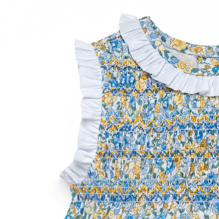 Designed for sunlit days and joyful moments, the Cristina Dress is crafted from 100% cotton for softness and comfort. The sleeveless silhouette allows for ease of movement, while delicate smocking and ruffled trims draw from European tradition. Featuring the artful, custom Sunshine Floral pattern in morning blue and marigold.