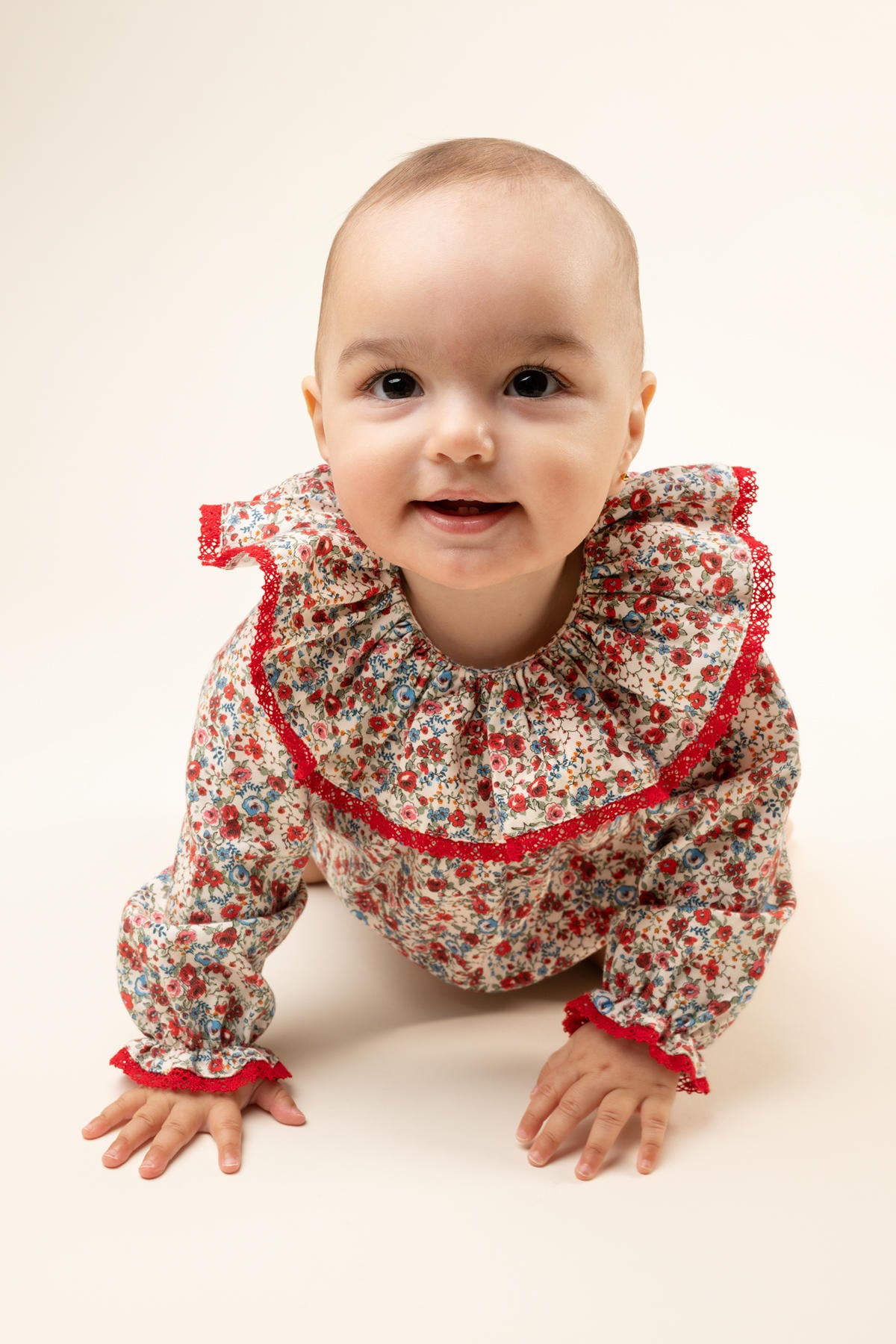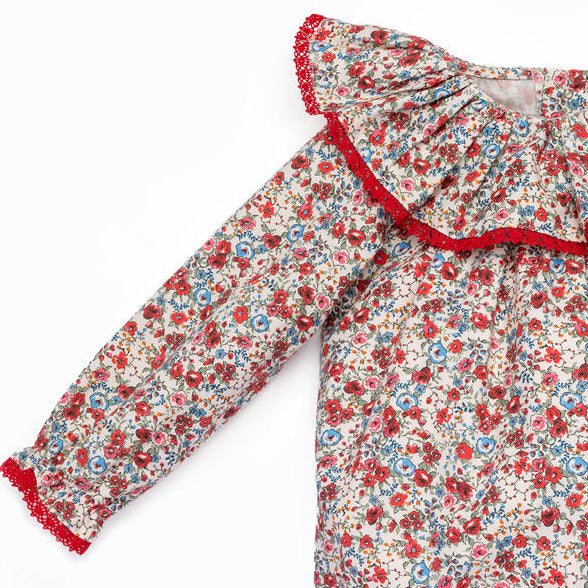 The Fabiola Romper in our exclusive Scarlet Garden print blends comfort with timeless charm. Its long sleeves and ruffled collar, both edged in rich red trim, frame the lively crimson and soft blue florals. Crafted from 100% cotton for softness, it features a relaxed silhouette that allows for easy movement, making it as practical as it is beautiful.